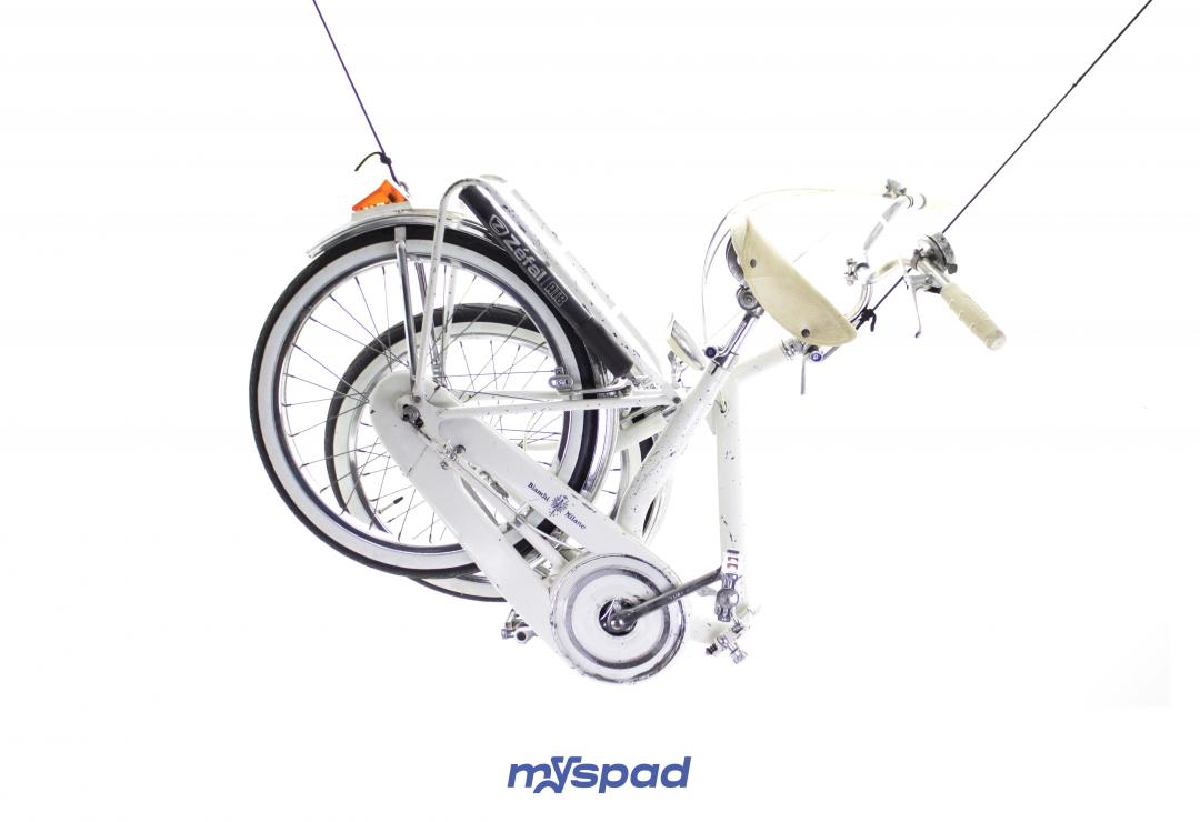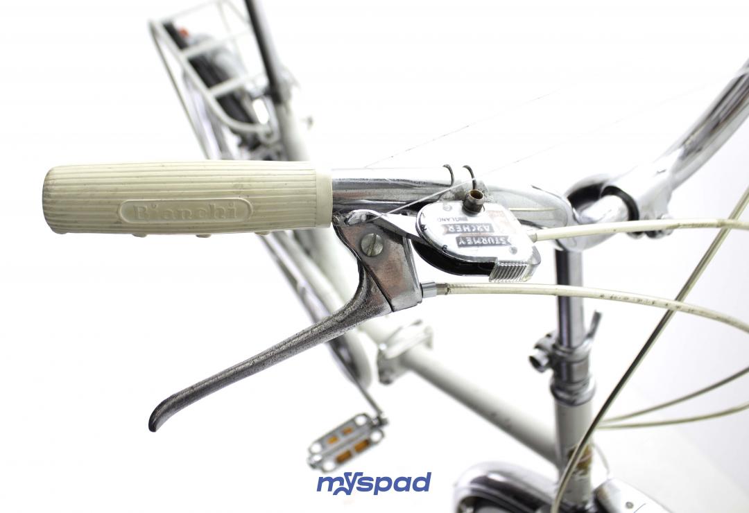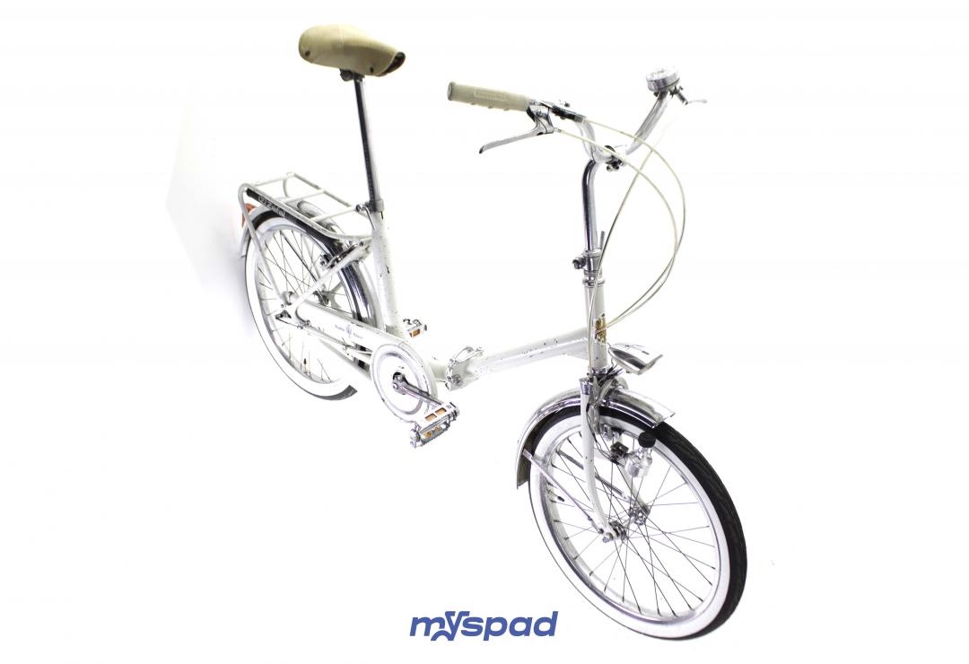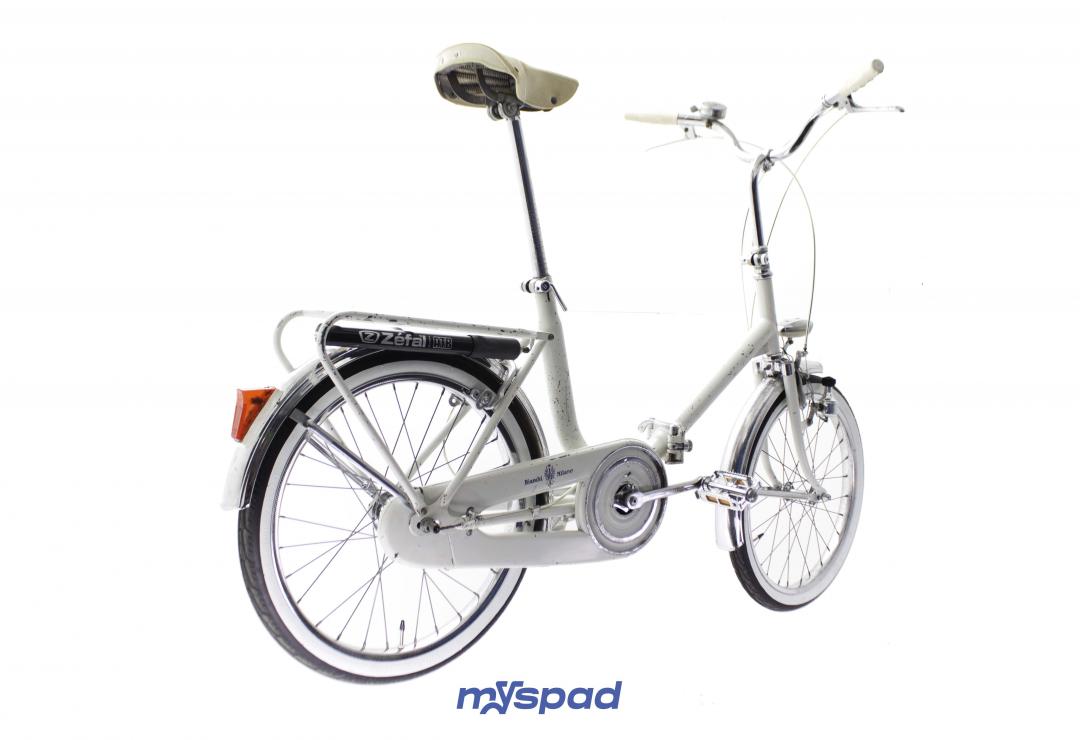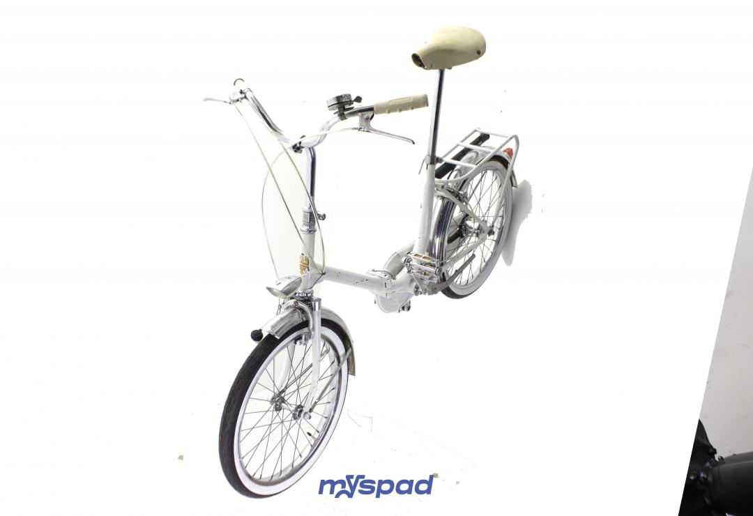 Bianchi Pliant Sturmey Archer distribué en France par Solex ou Motobecane (on retrouve des modèles identiques signés des différentes marques) C'est un magnifique vélo vintage, pliant et restauré avec passion par notre mécano (Zak !). Démonté intégralement et restauré pièce par pièce, l'usure de la peinture d'origine (55 ans tout de même) est visible par points et nous l'avons sur ce point volontairement conservé. Toutes les pièces fonctionnement parfaitement comme le moyeu Sturmay à 3 vitesses, la dynamo et ses lumières ou le système pour plier le vélo et baisser la tige de selle et la potence en quelques secondes. Une beauté.