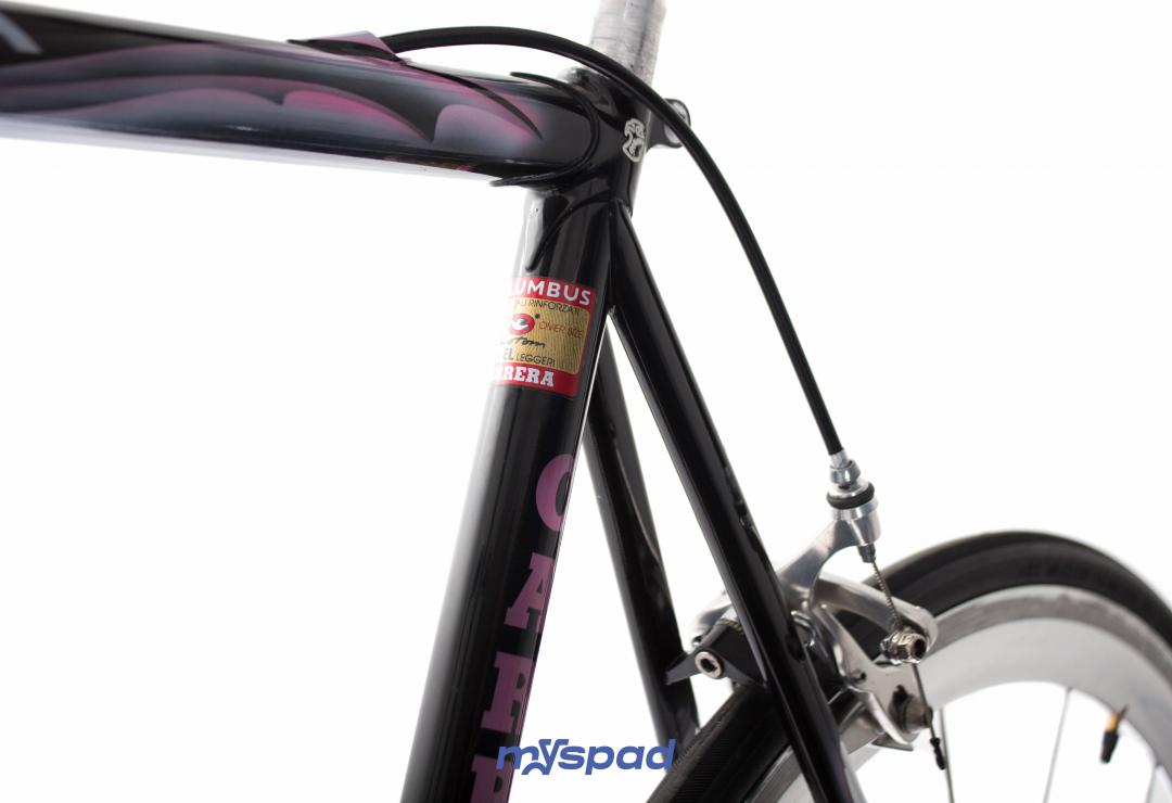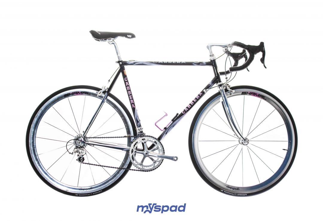 En état de conservation exceptionnel, nous l'avons monté avec un groupe Campagnolo Chorus 9 vitesses ! Pourquoi faire du vélo ordinaire quand on peut rouler sur une Carrera extraordinaire est une citation de la marque.