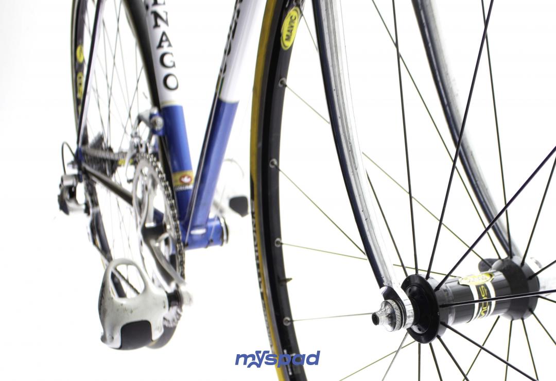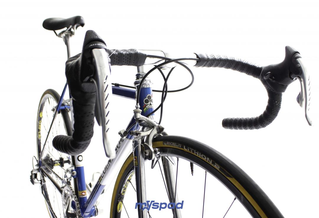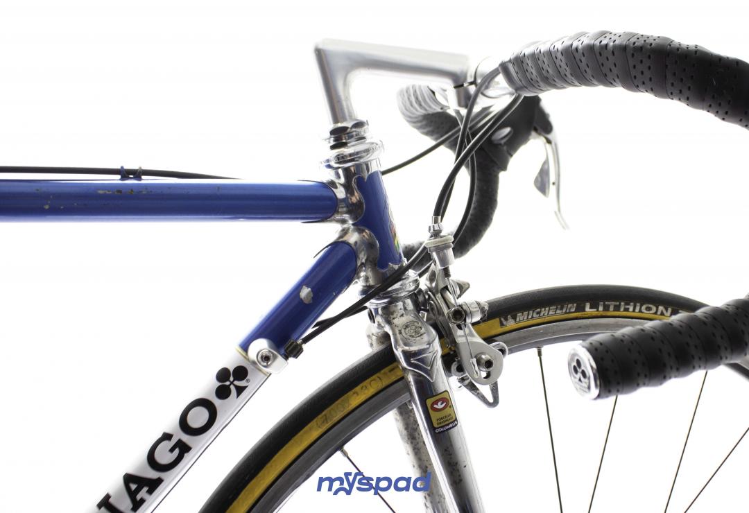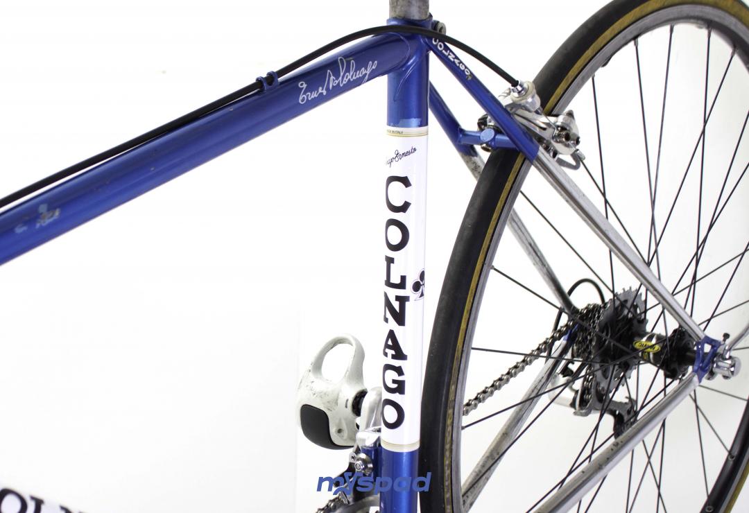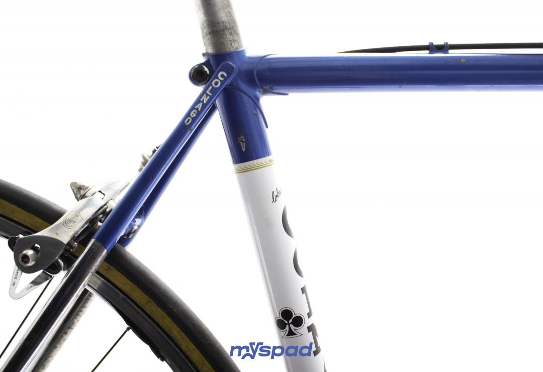 Un Colnago Mexico de petite taille et à petit prix. Restauré avec soins, il comporte néanmoins les traces de son existence passée avec ses éclats sur sa peinture d'origine et quelques traces superficielles de rouilles sur ces chromes. Monté en 8V pour le moderniser avec de belles roues Mavic Cosmos. Pour personne autour de 1m60 mais avec sa grande potence et sa tige de selle qui monte assez haut, il peut convenir jusqu'à 1m70 easy.