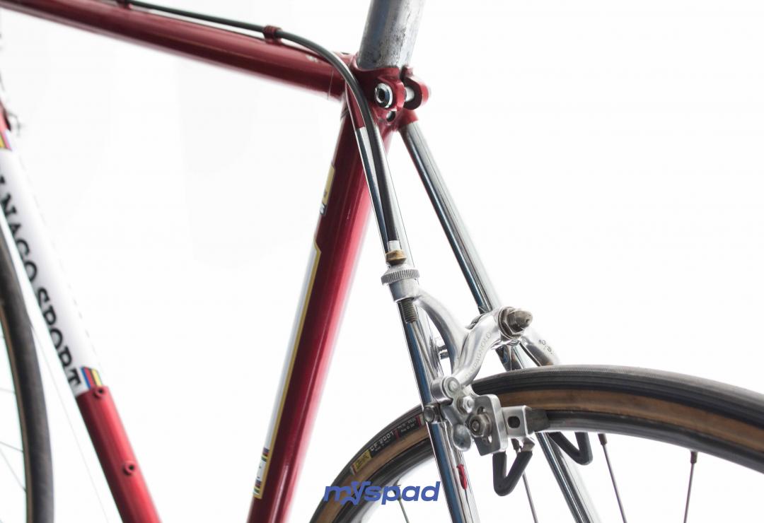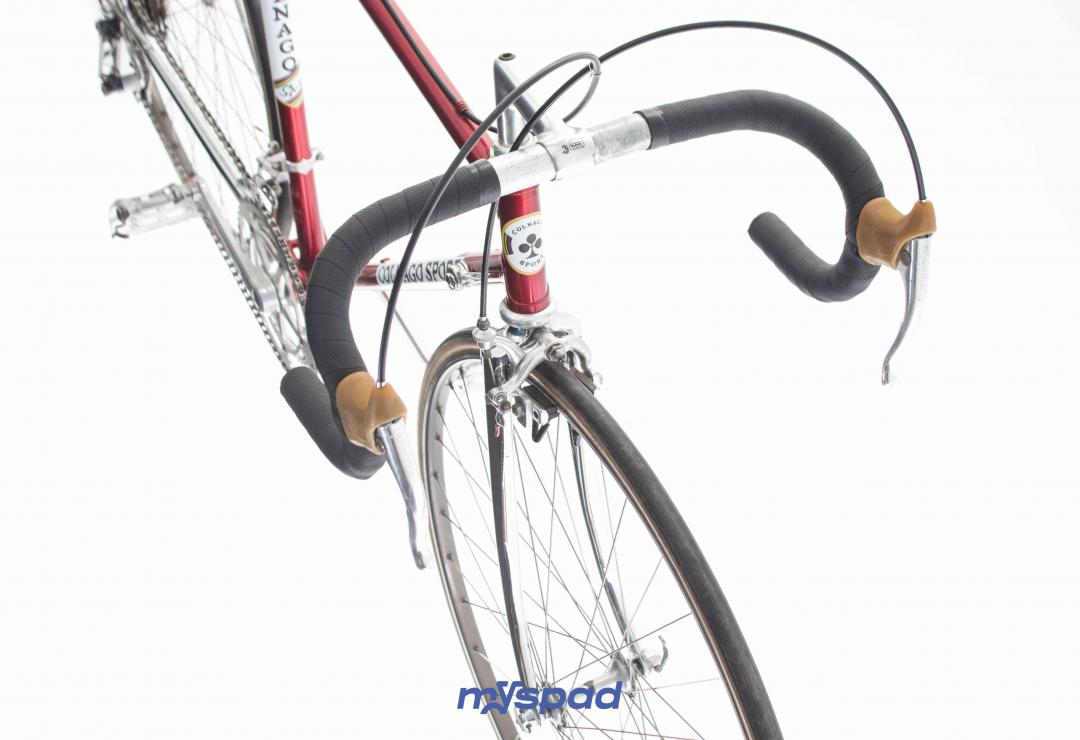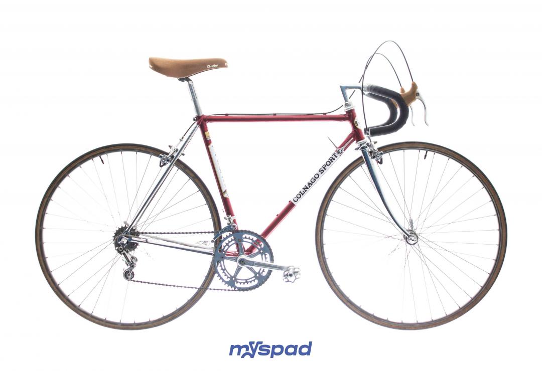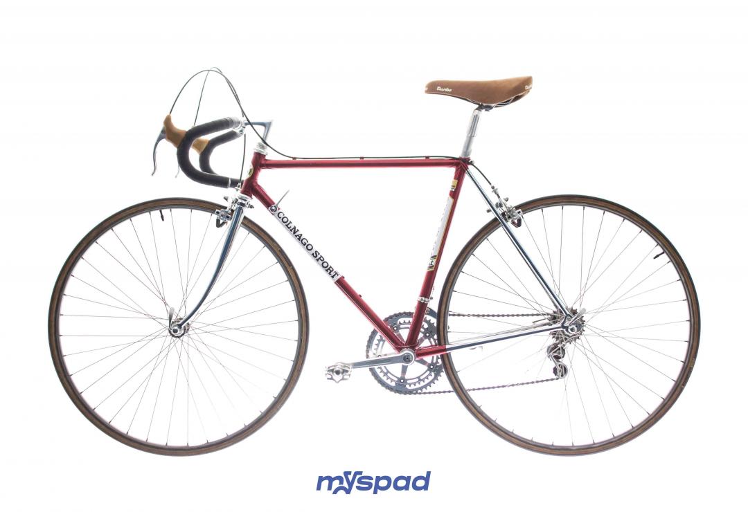 Le Colnago Sport est un modèle d'entrée de gamme mais non moins qualitative de la marque italienne. Il était destiné aux marchés américains et germaniques. S'il n'est pas gravé du traditionnel trèfle de la marque, le cadre en tubes Columbus et au pattes arrières Campagnolo témoigne des mêmes exigences de finition que ses homologues plus hauts de gamme. Ce cadre en excellent état de conservation est équipé d'une transmission Campagnolo Record, le haut de gamme de l'époque.