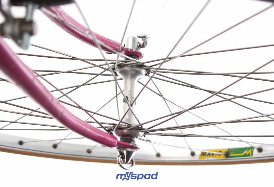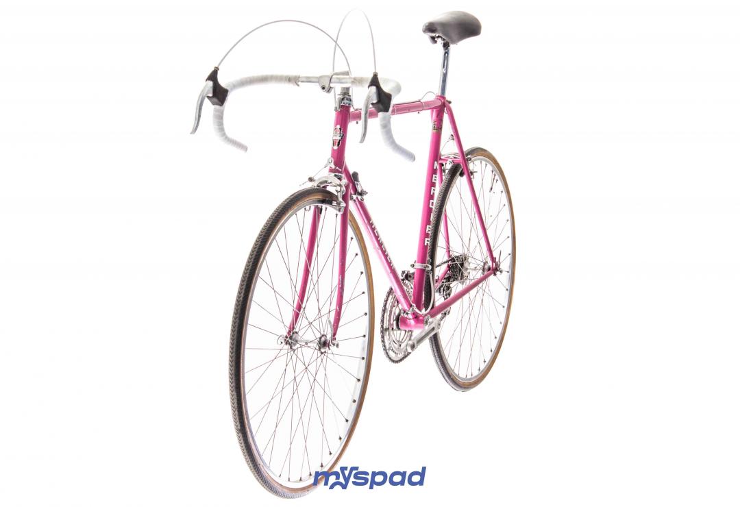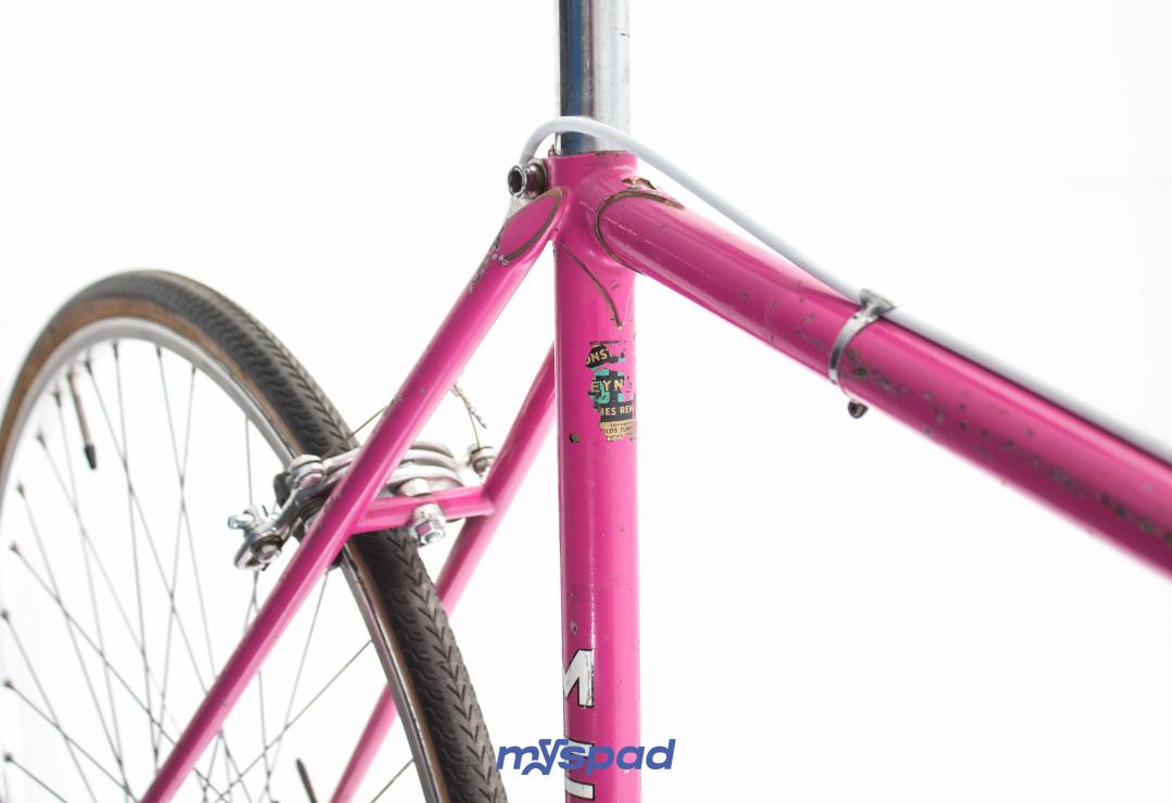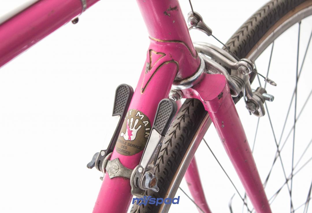 La célèbre marque de Saint-Etienne dont le rose est la couleur bannière a donné le nom du massif Alpin des Aravis à ce modèle de cadre aux finitions soignées. Restauré avec ses groupes d'origine en Mafac et Simplex le vélo présente quelques traces du temps qui n'enlèvent rien à son charme. À l'aise en ville et sur les longs trajets, il sera un bon compagnon pour toute virée. Laissez-vous guider par la panthère rose, sur les traces de Raymond Poulidor.