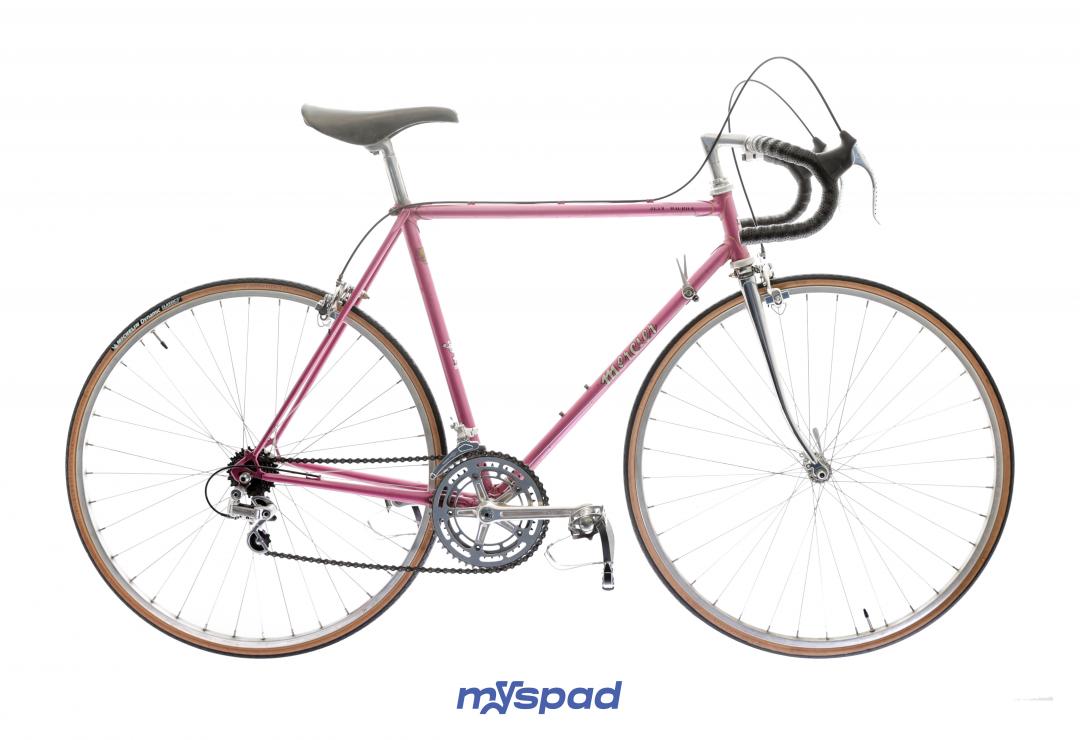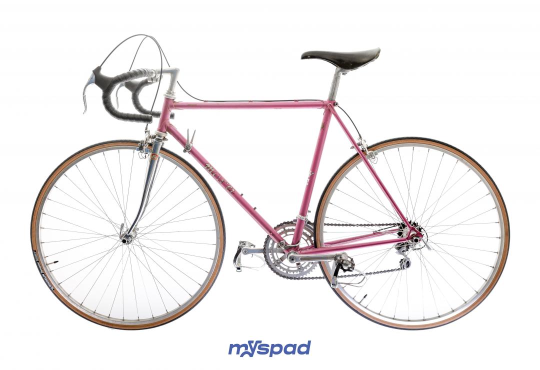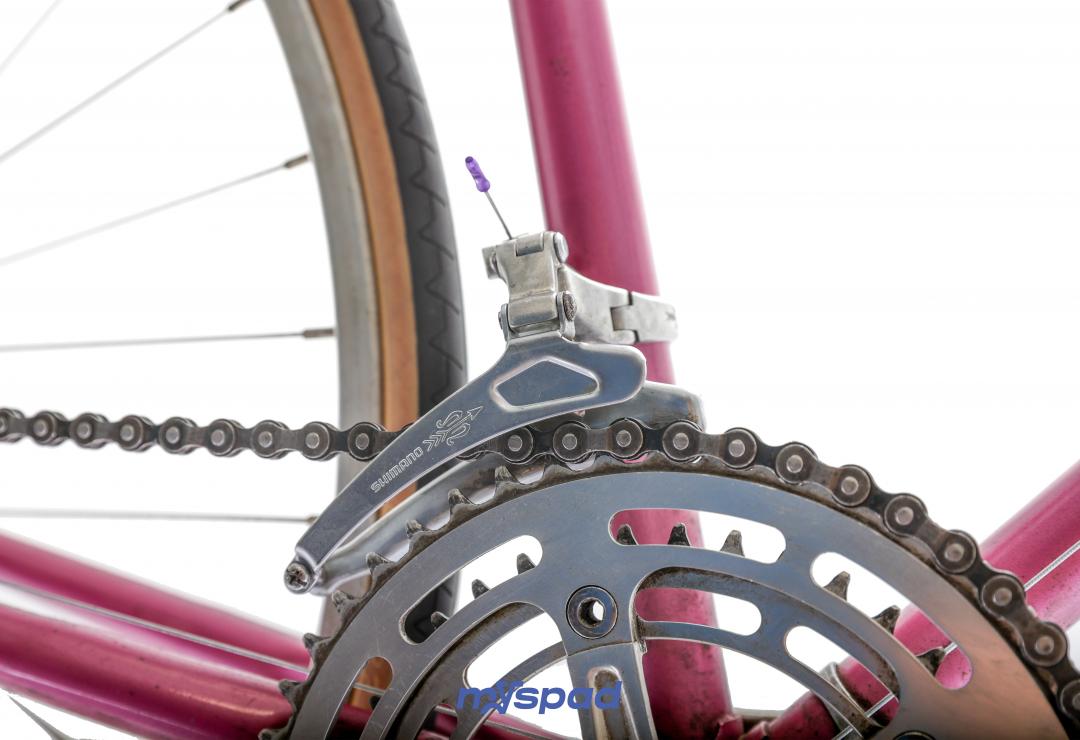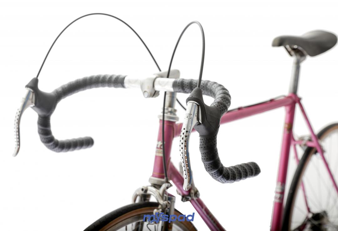 Le mythique vélo de Poulidor dans sa version course, numéroté et en Shimano haut de gamme. Le pédalier Dura-Ace et un groupe composé de Shimano 600 pour le purfreinage (leviers et étriers) et Shimano Arrow pour les dérailleurs. Une belle mécanique pour un vélo toujours aussi efficace et qui fera toujours bel effet.