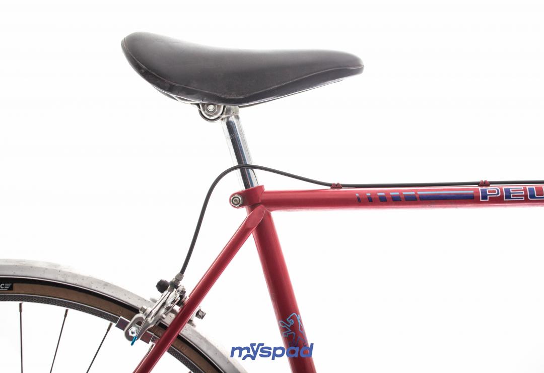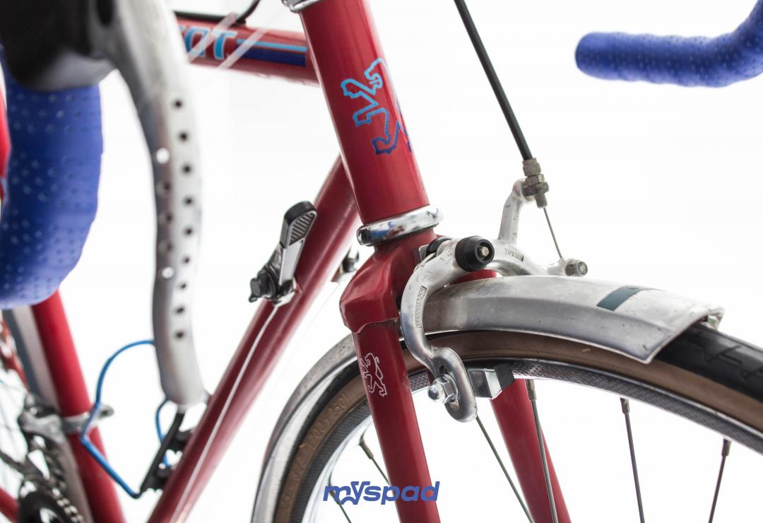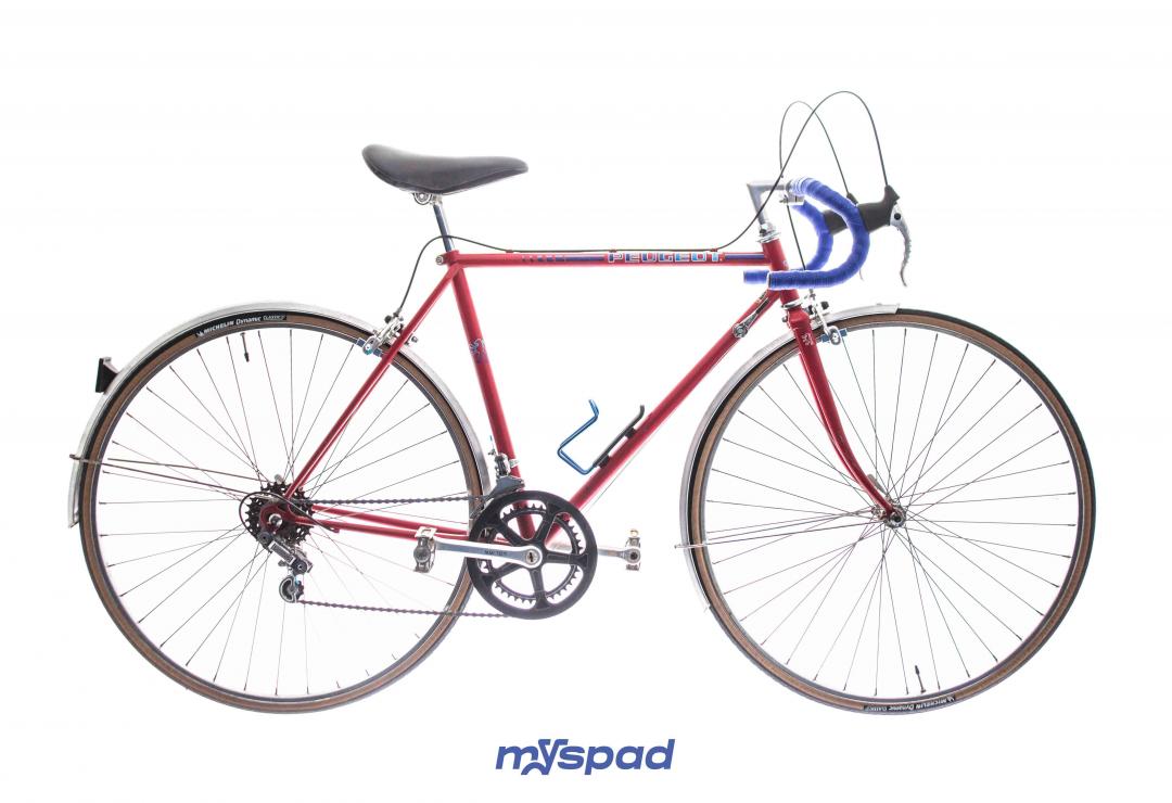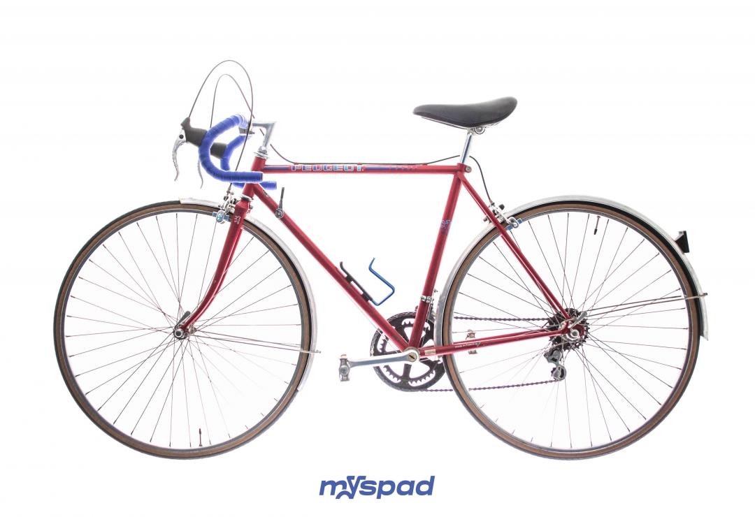 Un Peugeot simple et efficace aux belles couleurs rouge et bleu, équipé de garde-boues pour toutes les saisons.