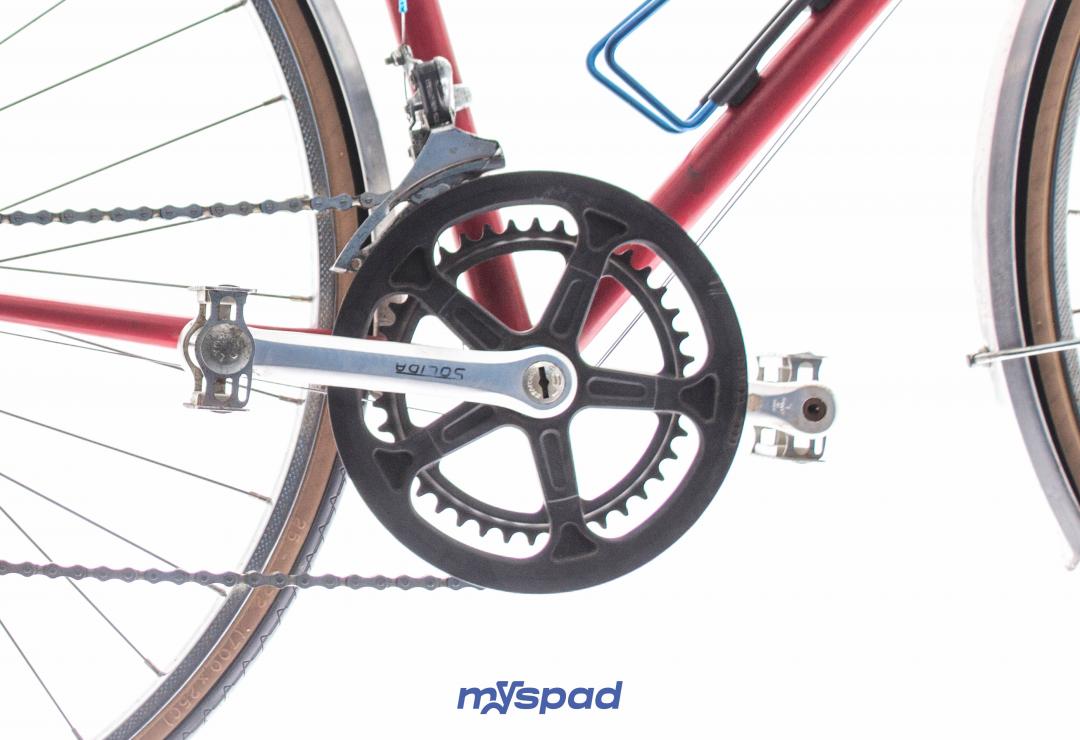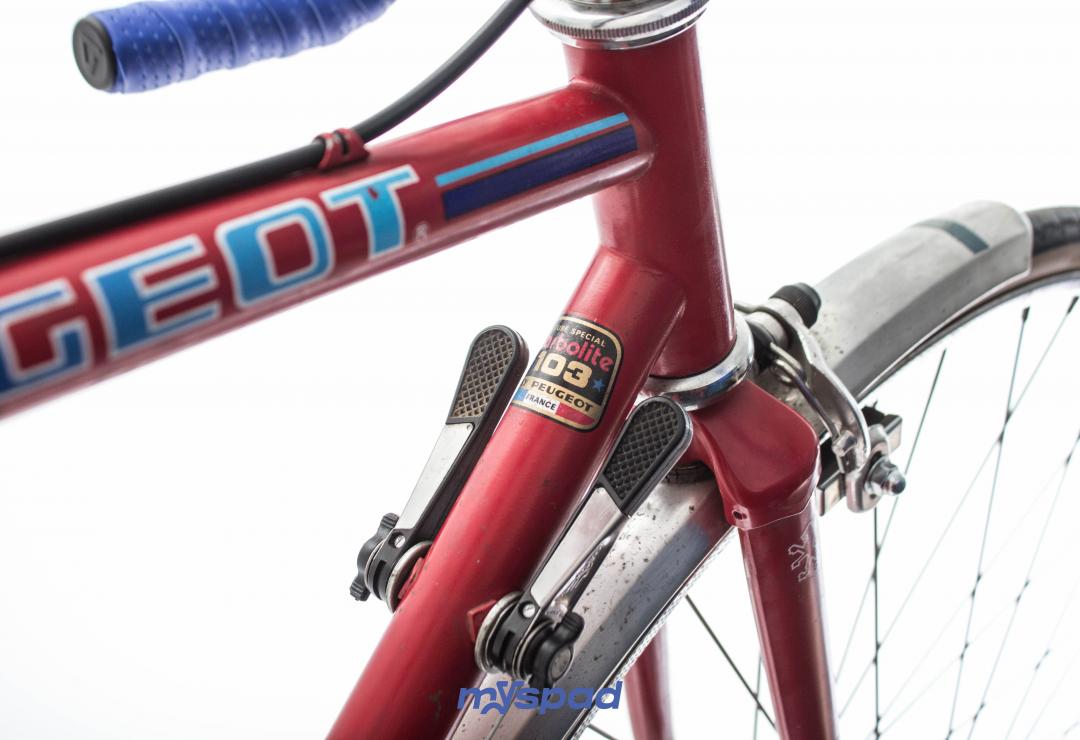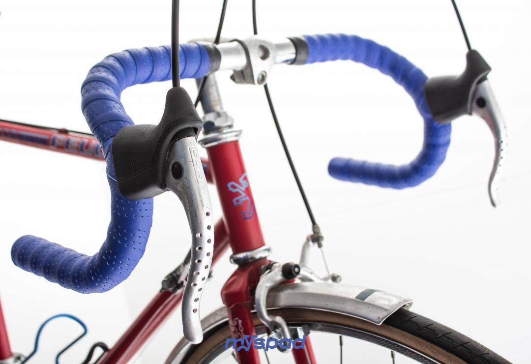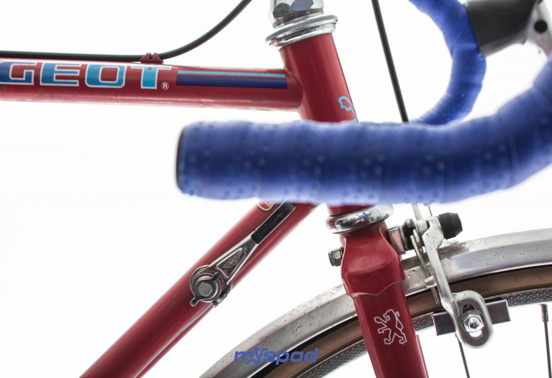 Un Peugeot simple et efficace aux belles couleurs rouge et bleu, équipé de garde-boues pour toutes les saisons.