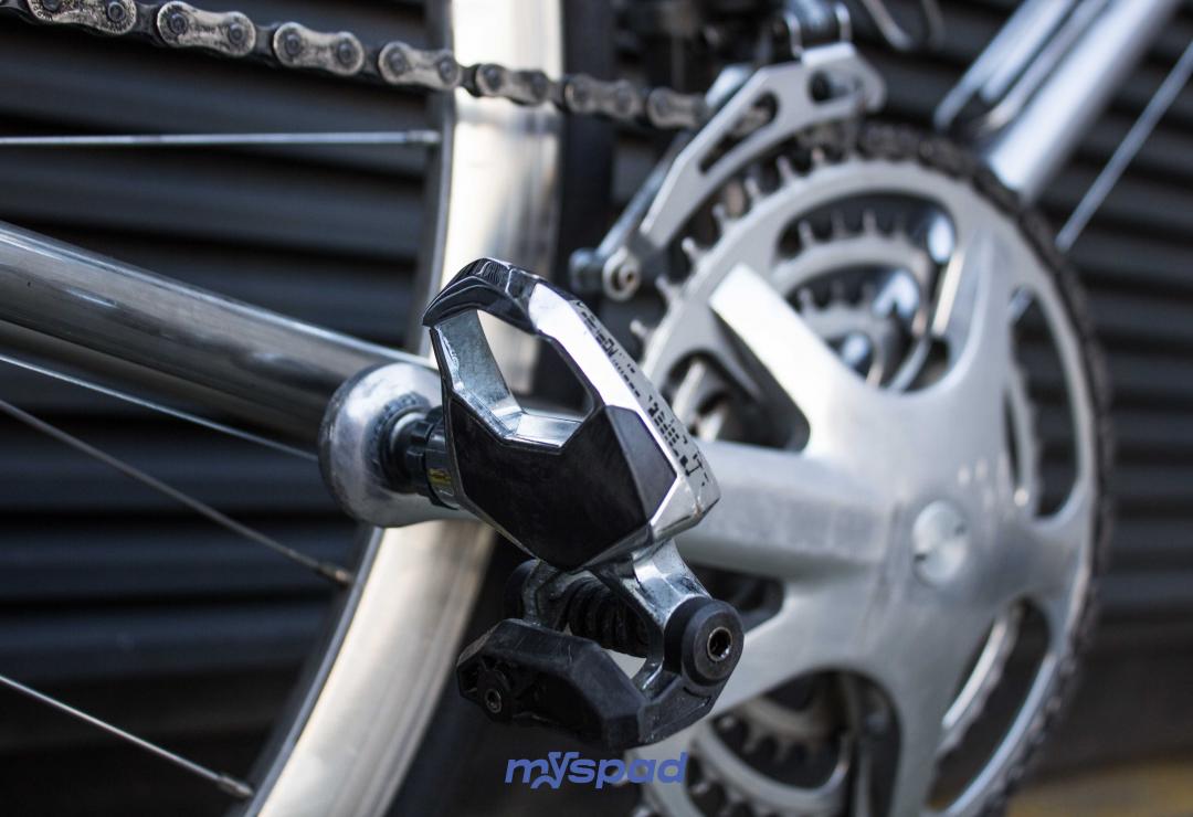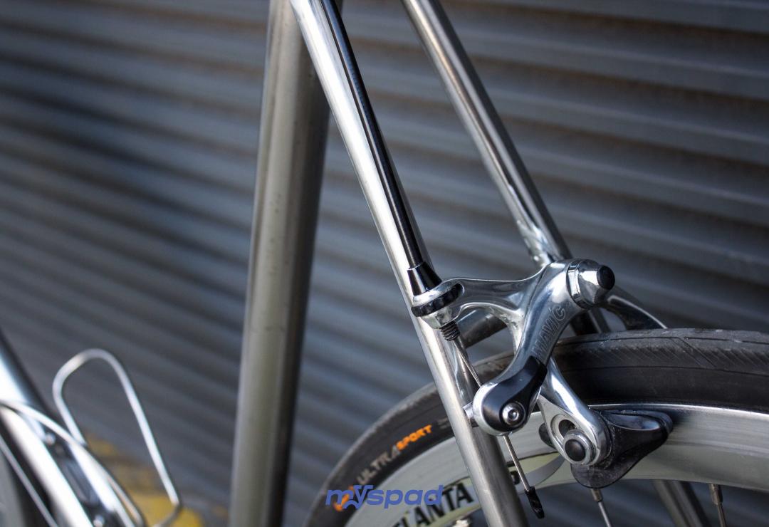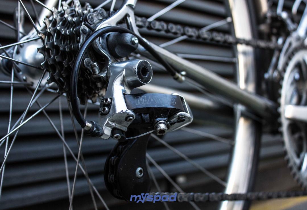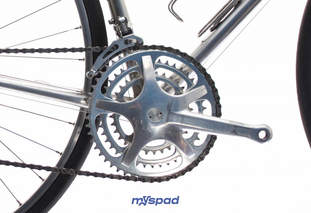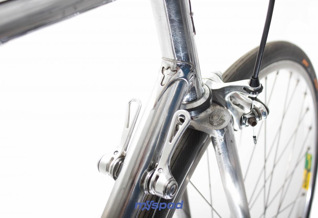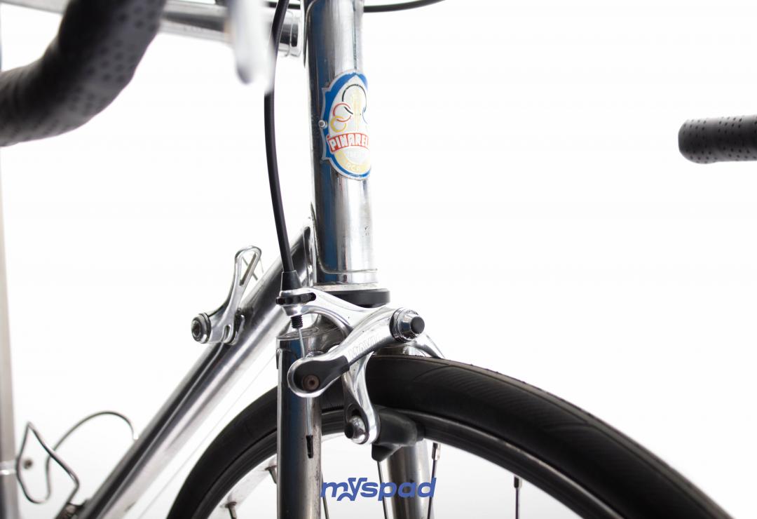 Ce Pinarello est intégralement monté en Mavic SSC. Un groupe extrêmement rare et très bien conservé! Un pédalier Mavic Starfish, des roues re rayonnés avec les moyeux Mavic SSC. Les leviers, les étriers Mavic 451, la potence et le cintre sont également estampillés Mavic, les pédales aussi, mavic Automatic (visible sur les dernières photos).