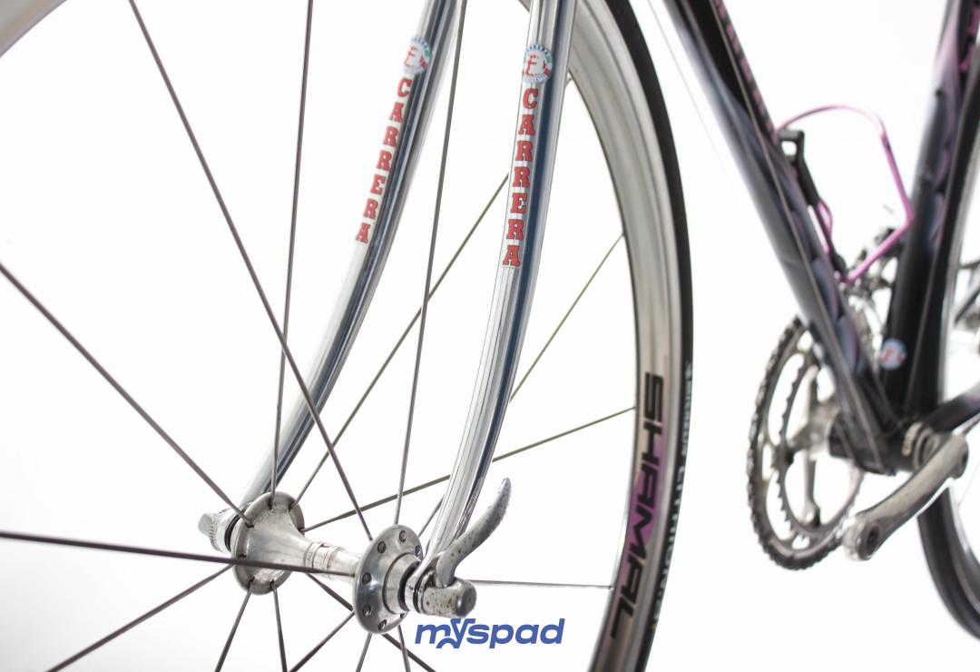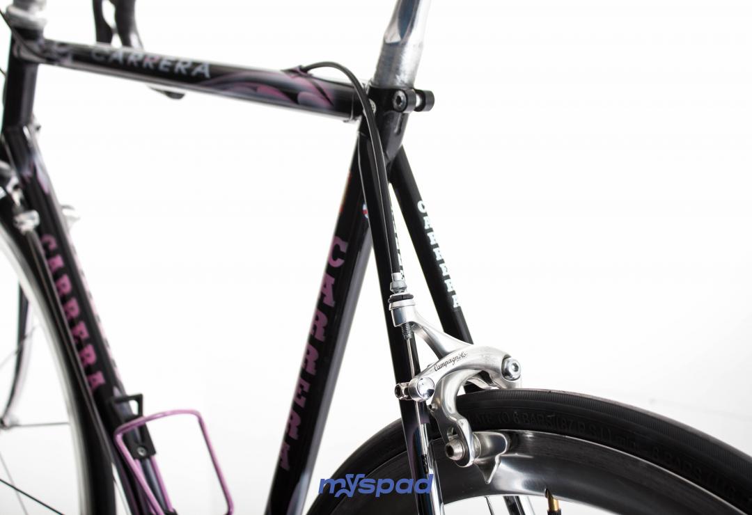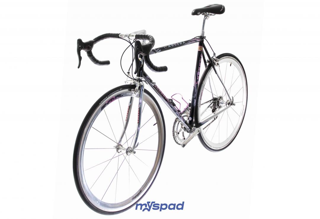 En état de conservation exceptionnel, nous l'avons monté avec un groupe Campagnolo Chorus 9 vitesses ! Pourquoi faire du vélo ordinaire quand on peut rouler sur une Carrera extraordinaire est une citation de la marque.