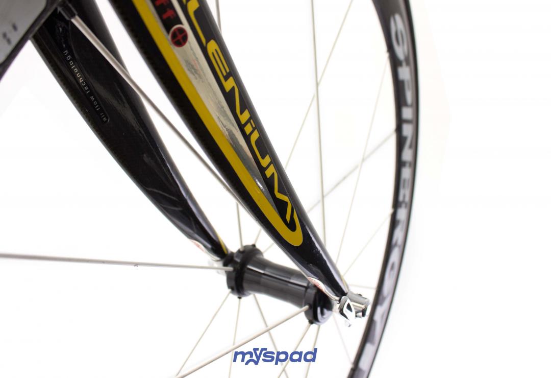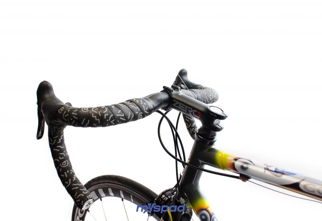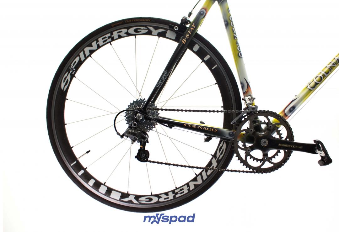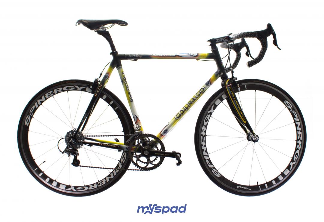 Le grand classique de la marque au trèfle ! Si vous ne le connaissez pas encore, il est temps de l'essayer ! Le vélo qui a remporté 5 fois le Paris-Roubaix  Ses composants, du cadre au groupe de transmission sont fabriqués en Italie. Celui-ci est équipé avec un groupe plus moderne, en Campagnolo 10 vitesses ! Un pédalier carbone, un cintre aéro et une fourche carbone Time. Son cadre avec sa peinture incroyable "art decor" (LX14) fera des envieux.  L'excellence dans ce domaine se trouve bien chez Colnago Des roues carbone (avec bande de freinage en aluminium pour mieux accrocher aux patins) Fourni avec un porte bidon Elite carbone (non visible sur les photos) et des pédales Look Keo. Un peu d'histoire du Colnago C40 :  Le Colnago C40 est un vélo de route emblématique qui a été produit par la société italienne Colnago. Il a été introduit pour la première fois en 1994 et est rapidement devenu un favori parmi les cyclistes professionnels et les passionnés de vélo du monde entier. Le C40 était le successeur du célèbre Colnago C35, qui avait été le premier vélo de route en fibre de carbone de Colnago. Le C40 a été conçu en collaboration avec Ferrari Engineering et a bénéficié des technologies de pointe utilisées dans l'industrie automobile. L'une des caractéristiques les plus marquantes du Colnago C40 était son cadre en fibre de carbone monocoque. Ce cadre était fabriqué en utilisant des couches de fibre de carbone stratifiées et collées ensemble, ce qui permettait d'obtenir une structure légère et rigide.